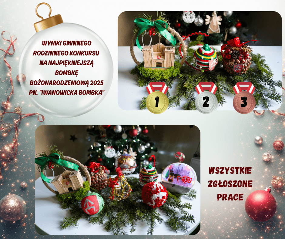 Po odbiór nagród i bombek zapraszamy od 22.12.2025 r. od godziny 08:00 do Gminnego Centrum Kultury i Bibliotek w Iwanowicach w godzinach pracy.