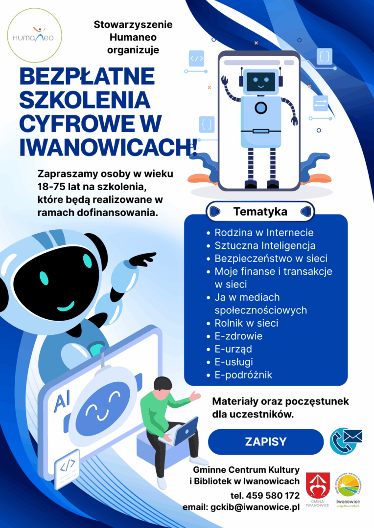 Stowarzyszenie Humaneo zaprasza na cykl BEZPŁATNYCH szkoleń cyfrowych dla osób w wieku 18–75 lat.