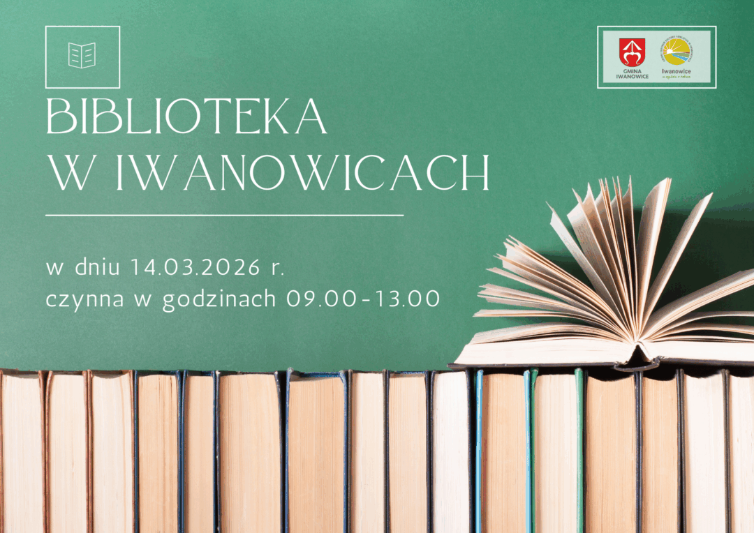 Biblioteka w Iwanowicach czynna w sobotę! 13 marca 2026 | Biblioteka, Informacje Szanowni Państwo, Drodzy Czytelnicy, Biblioteka w Iwanowicach w dniu 14.03.2026 r. czynną będzie w godzinach 09:00 – 13:00!