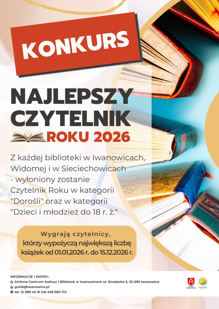Gminne Centrum Kultury i Bibliotek w Iwanowicach informuje o konkursie „Najlepszy czytelnik 2026 roku”.