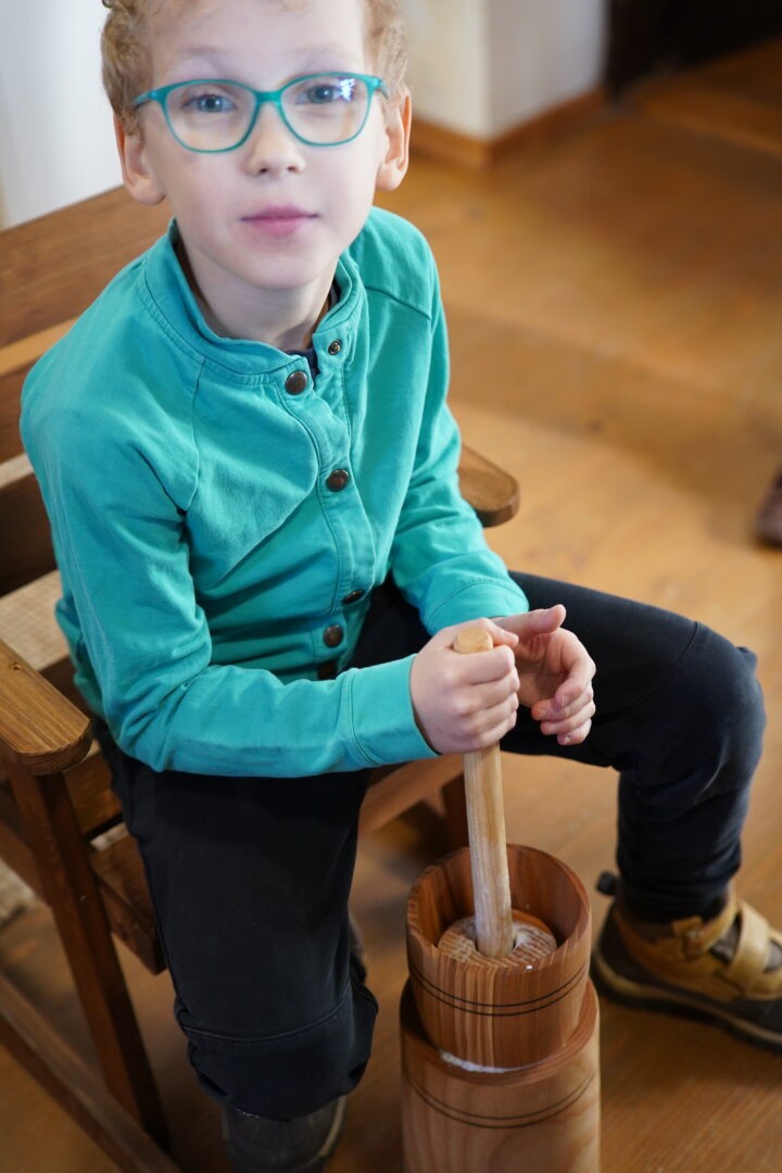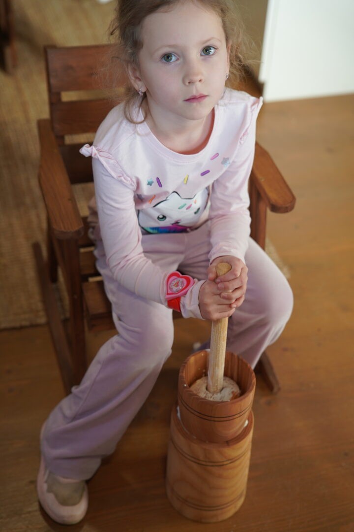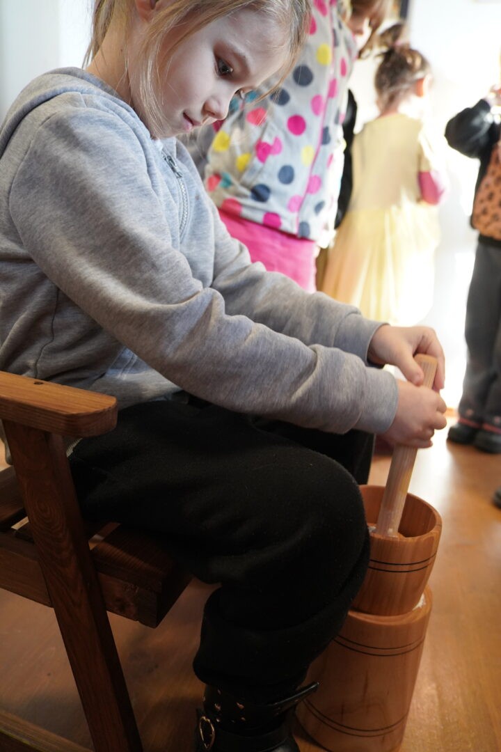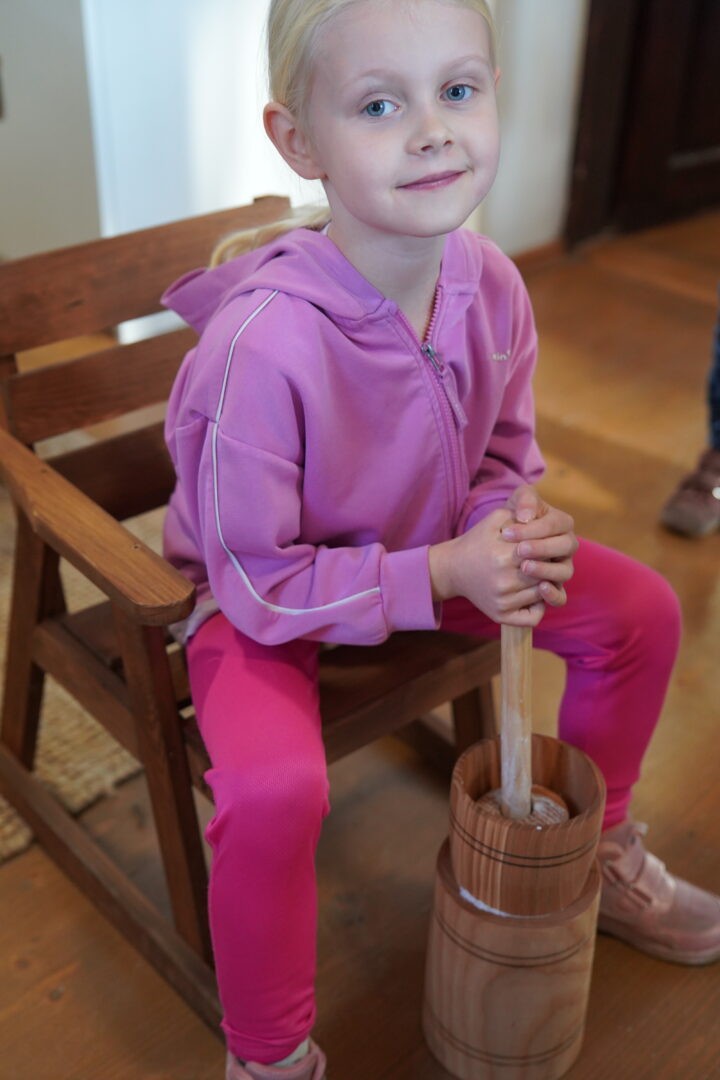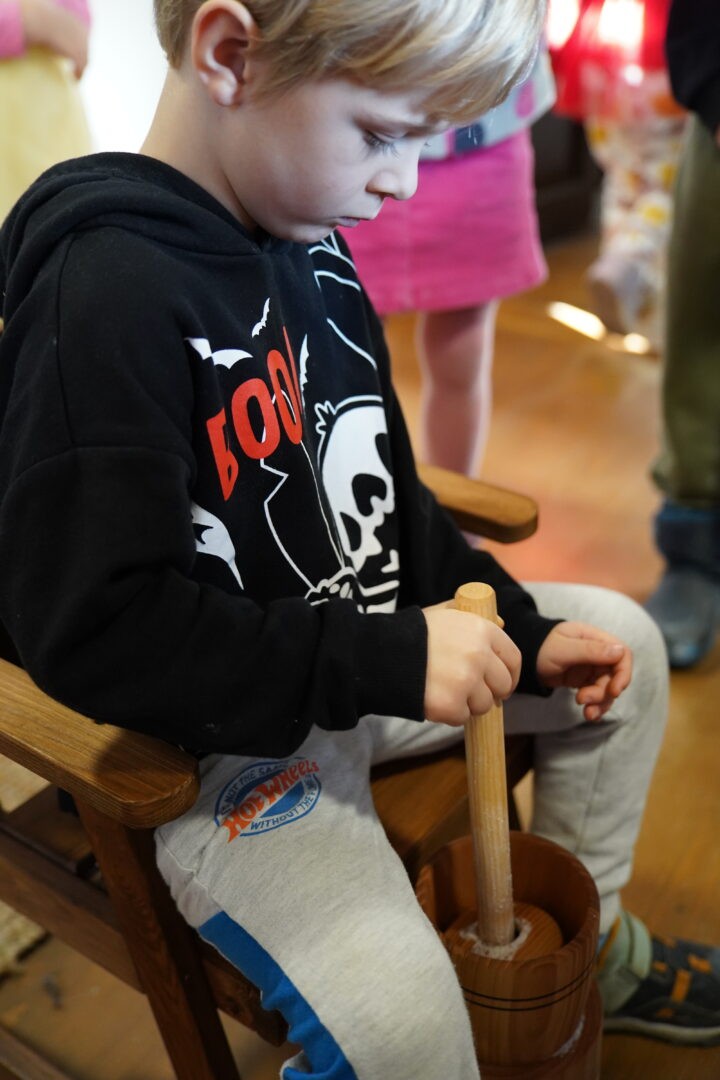 Tym razem postawiliśmy przed sobą ambitne zadanie – wykonanie prawdziwego masła w maselnicy, „jak za dawnych czasów”. Każde dziecko mogło spróbować swoich sił i przekonać się, że ubijanie masła wymaga cierpliwości oraz sporego wysiłku.