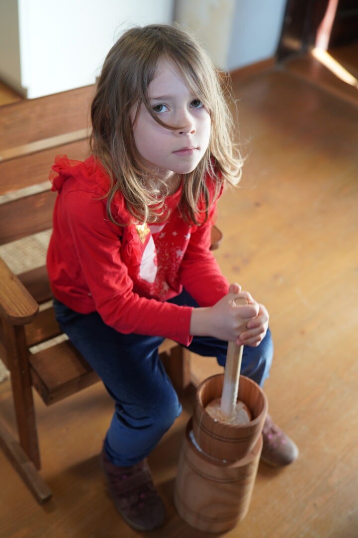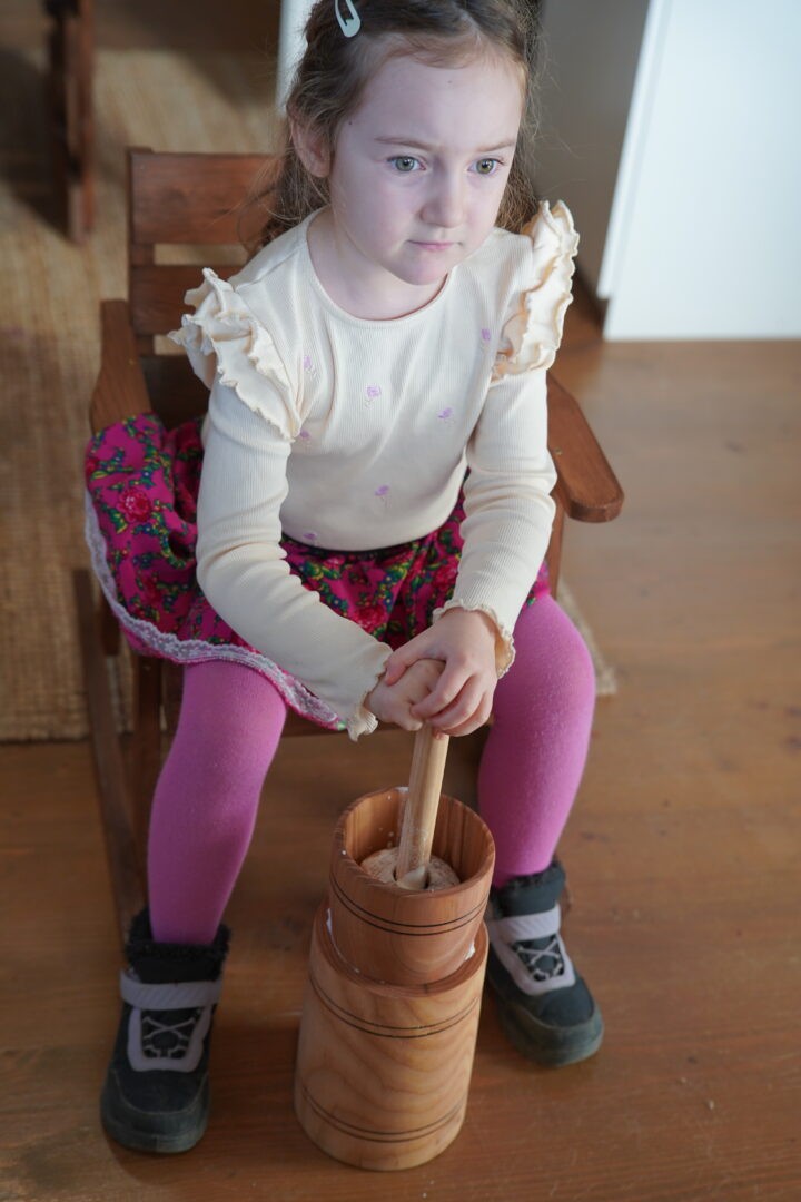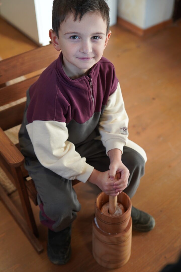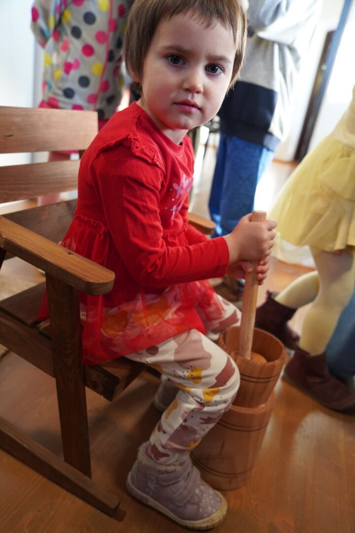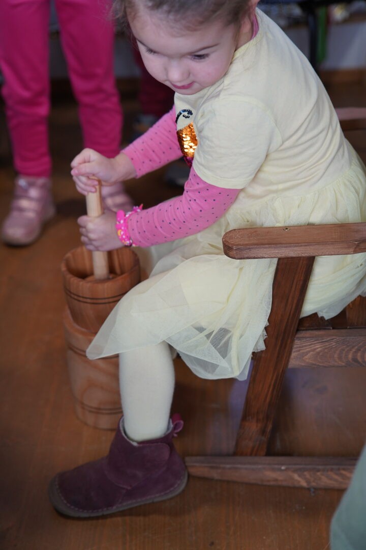 Tym razem postawiliśmy przed sobą ambitne zadanie – wykonanie prawdziwego masła w maselnicy, „jak za dawnych czasów”. Każde dziecko mogło spróbować swoich sił i przekonać się, że ubijanie masła wymaga cierpliwości oraz sporego wysiłku.