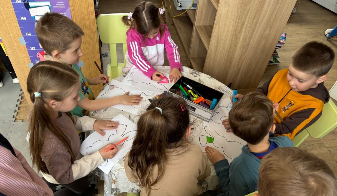 Dzieci wysłuchały Historyjki Beatrix Potter pt. „𝑲𝒓𝒐́𝒍𝒊𝒄𝒛𝒆𝒌 𝑷𝒊𝒐𝒕𝒓𝒖𝒔́” oraz „𝑴𝒐𝒕𝒚𝒍𝒆𝒌 𝑫𝒚𝒛𝒊𝒐, 𝒌𝒕𝒐́𝒓𝒚 𝒑𝒐𝒛𝒏𝒂𝒘𝒂ł 𝒔́𝒘𝒊𝒂𝒕”, a następnie miały za zadanie pokolorować króliki i motyle.
