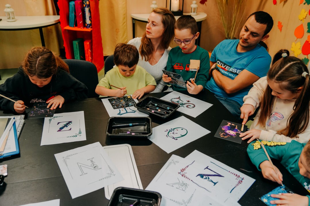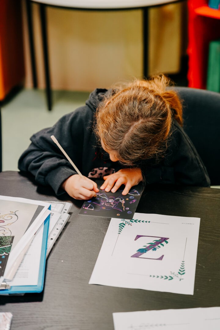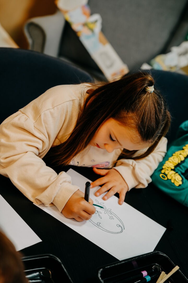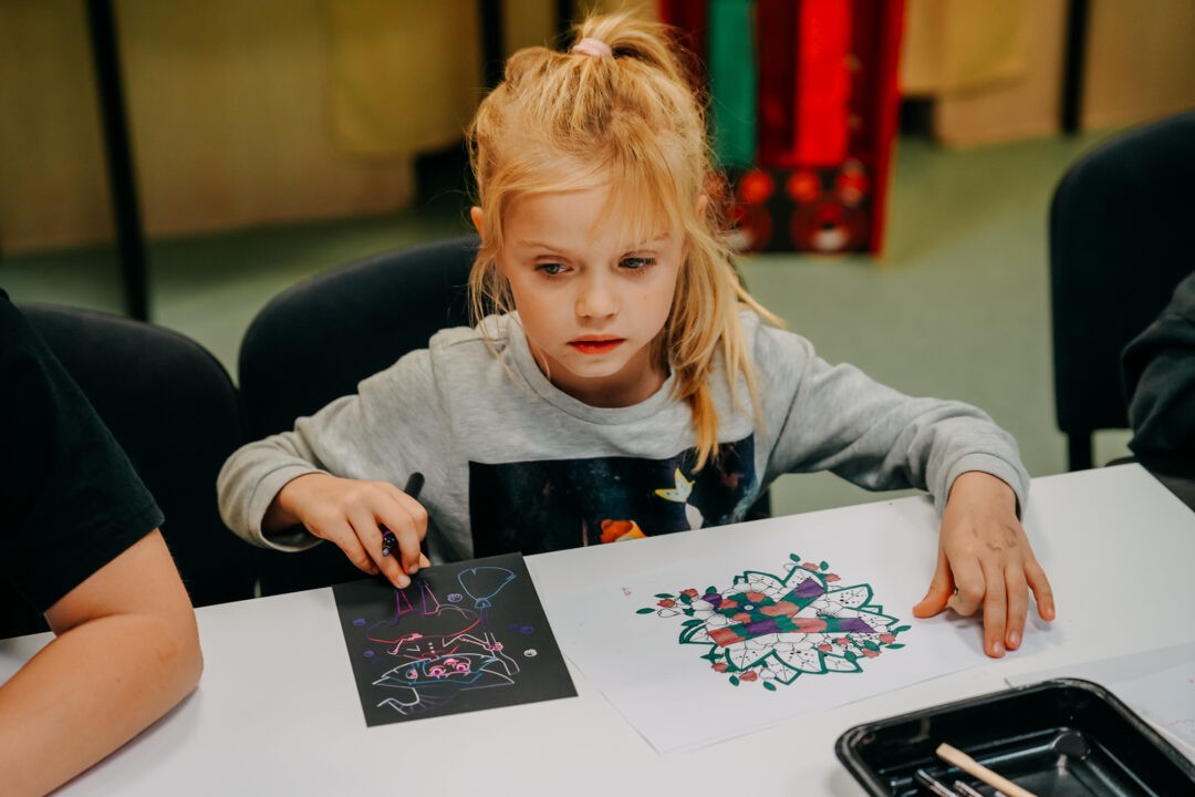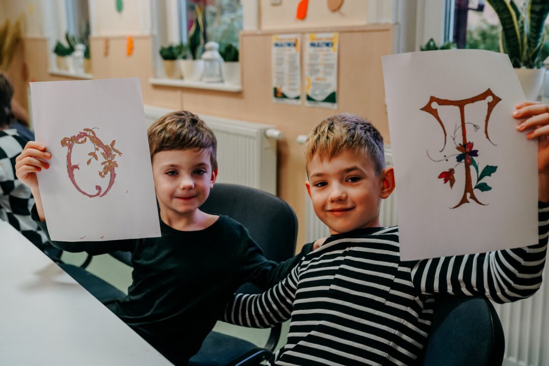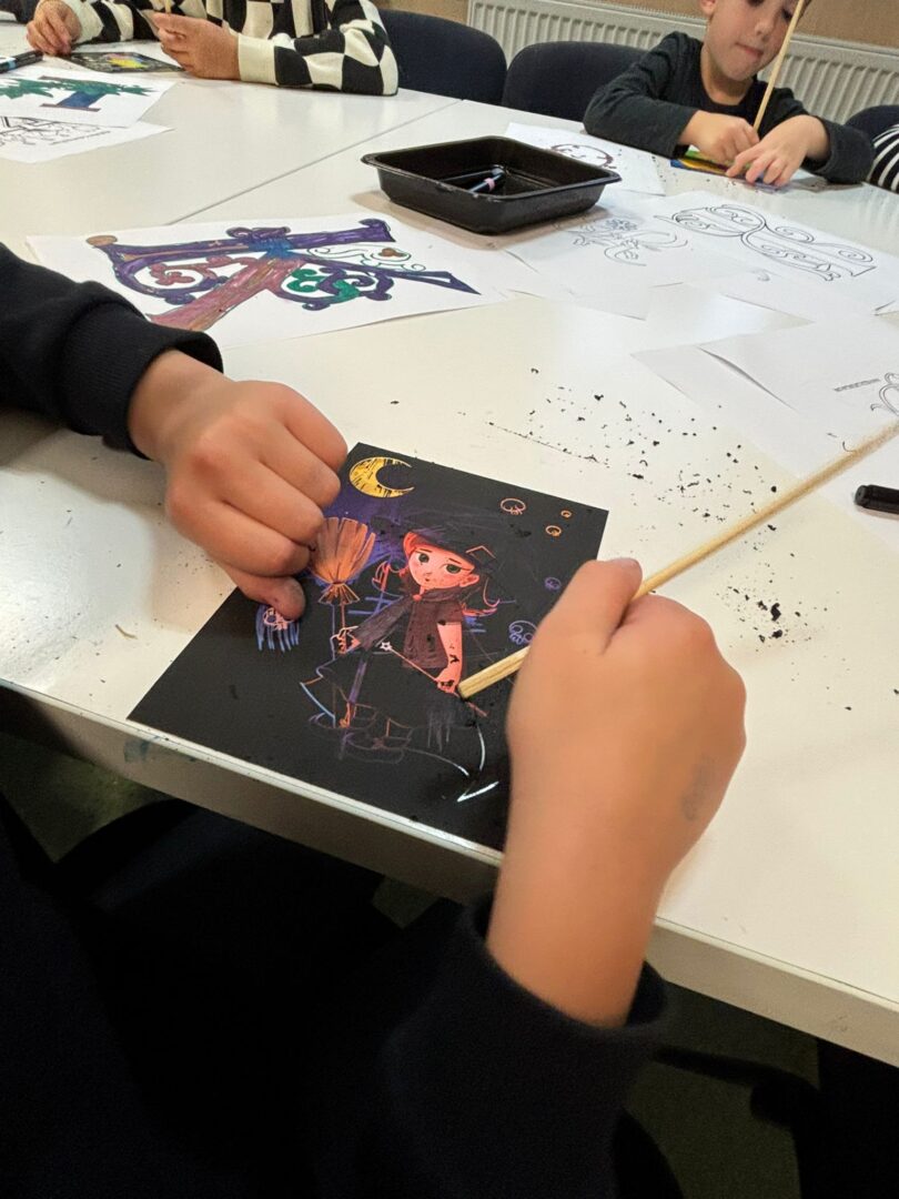 Kolejnym punktem programu była kaligrafia liter i kolorowe wydrapywanki. Dzieci poznawały historię kaligrafii, ozdabiały litery, wydrapywały postacie z bajek oraz tworzyły własne, fantazyjne rysunki na kolorowych pudełkach.
