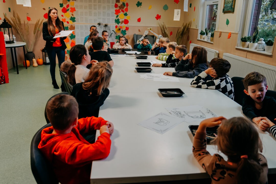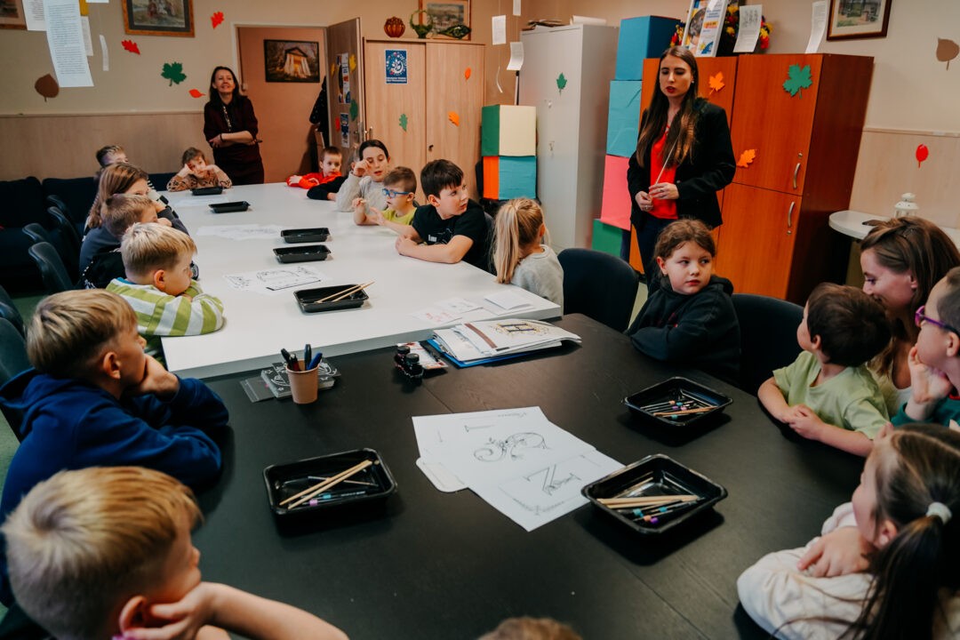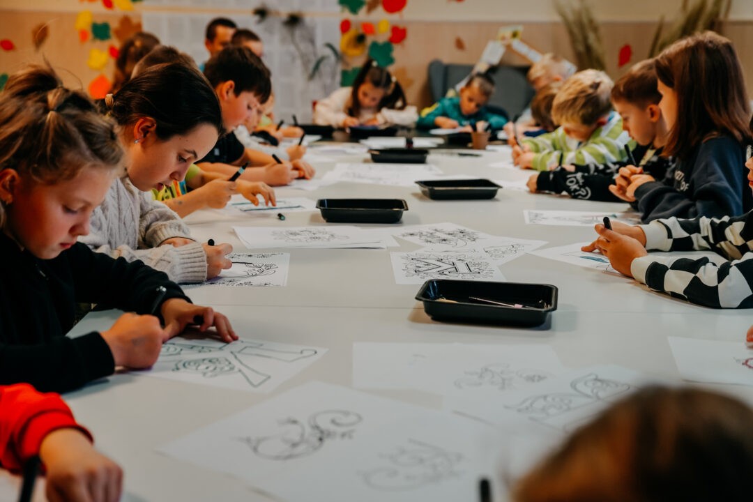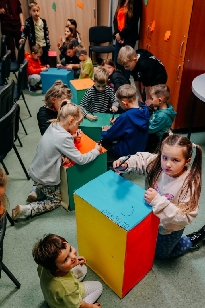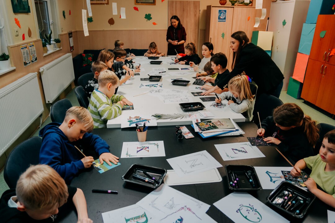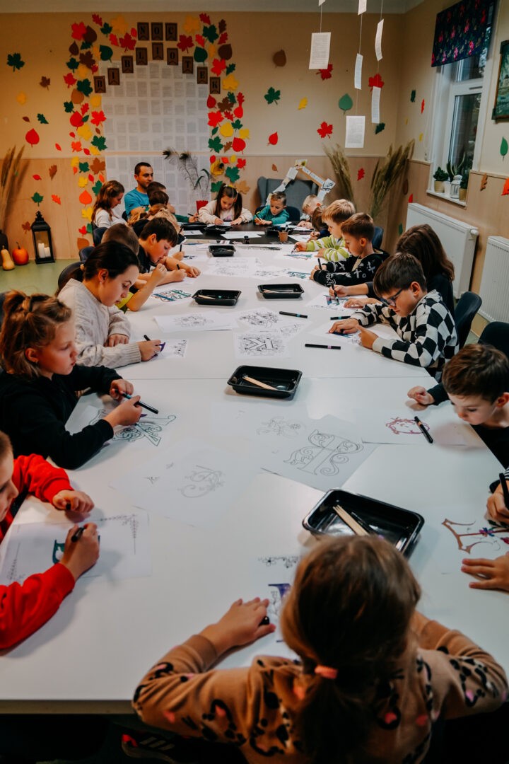 Kolejnym punktem programu była kaligrafia liter i kolorowe wydrapywanki. Dzieci poznawały historię kaligrafii, ozdabiały litery, wydrapywały postacie z bajek oraz tworzyły własne, fantazyjne rysunki na kolorowych pudełkach.