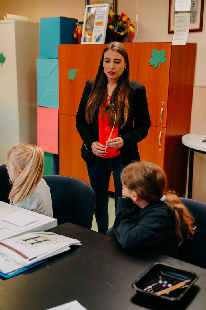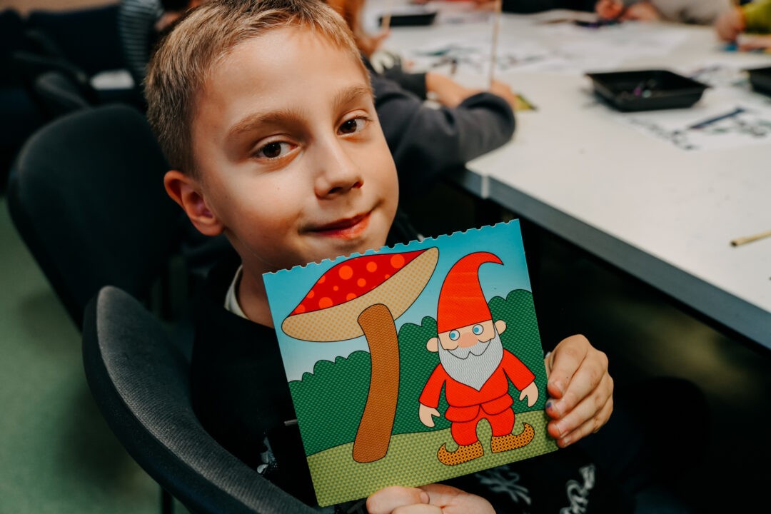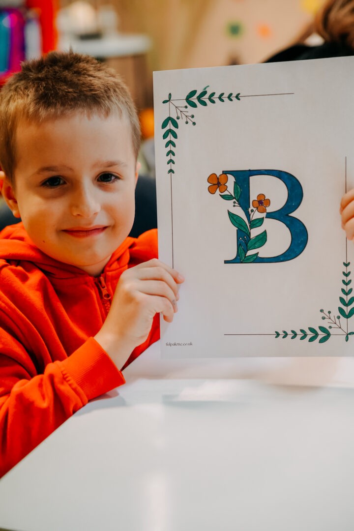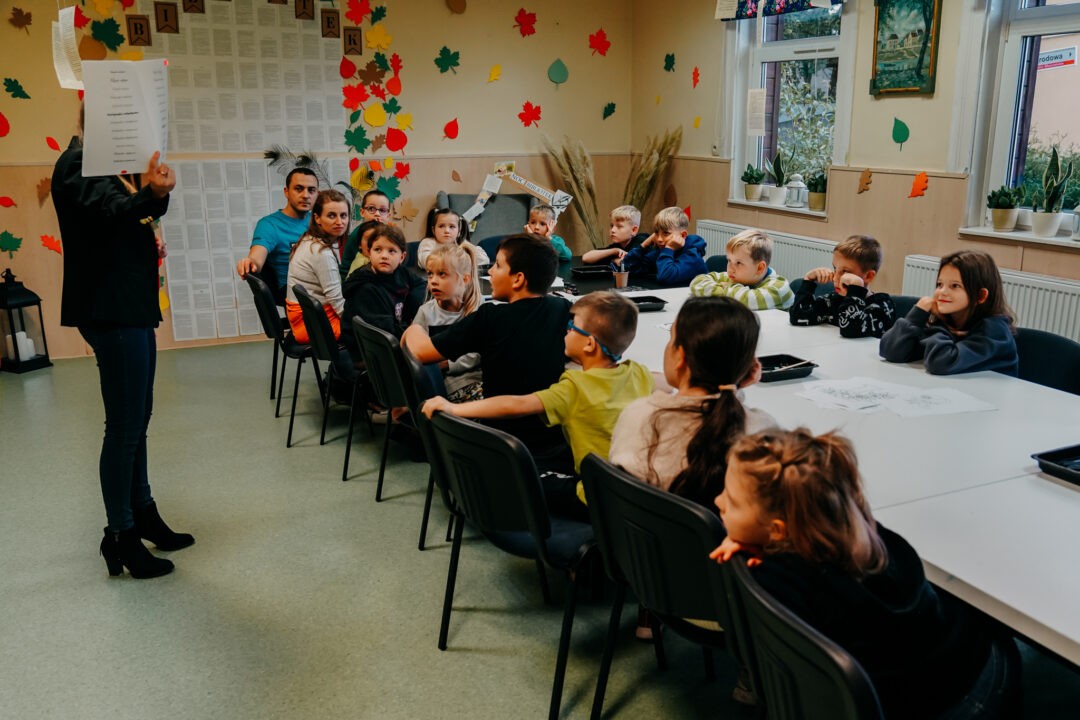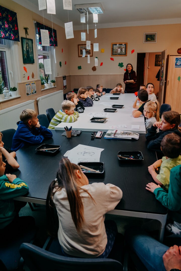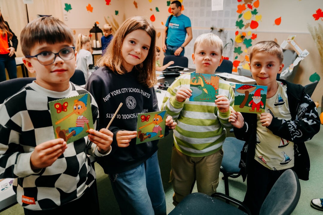 Kolejnym punktem programu była kaligrafia liter i kolorowe wydrapywanki. Dzieci poznawały historię kaligrafii, ozdabiały litery, wydrapywały postacie z bajek oraz tworzyły własne, fantazyjne rysunki na kolorowych pudełkach.