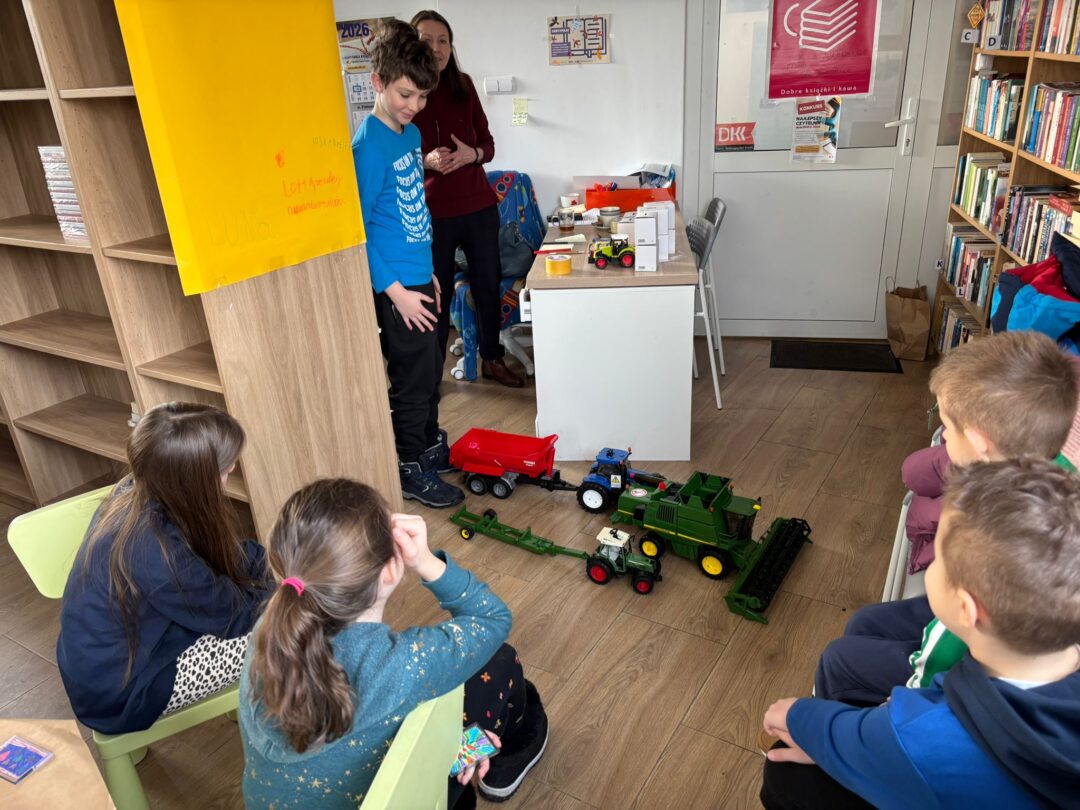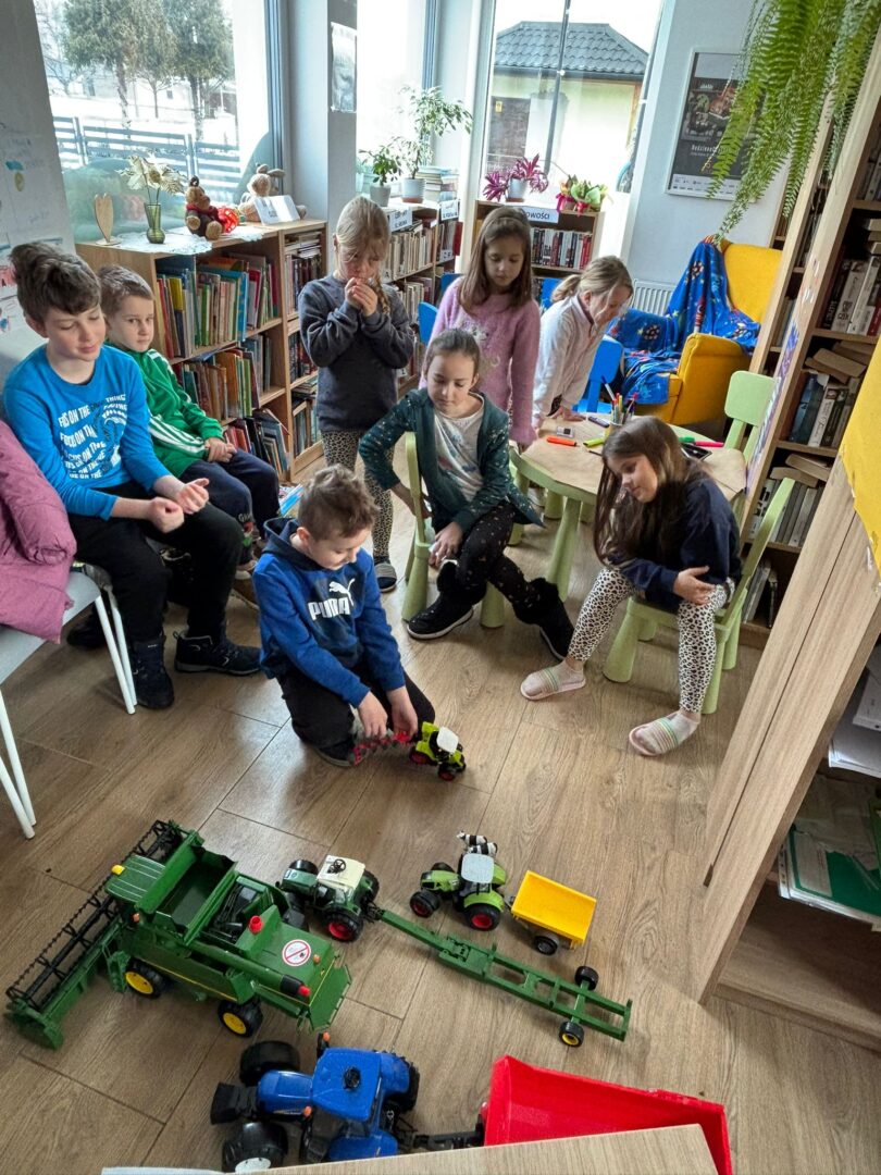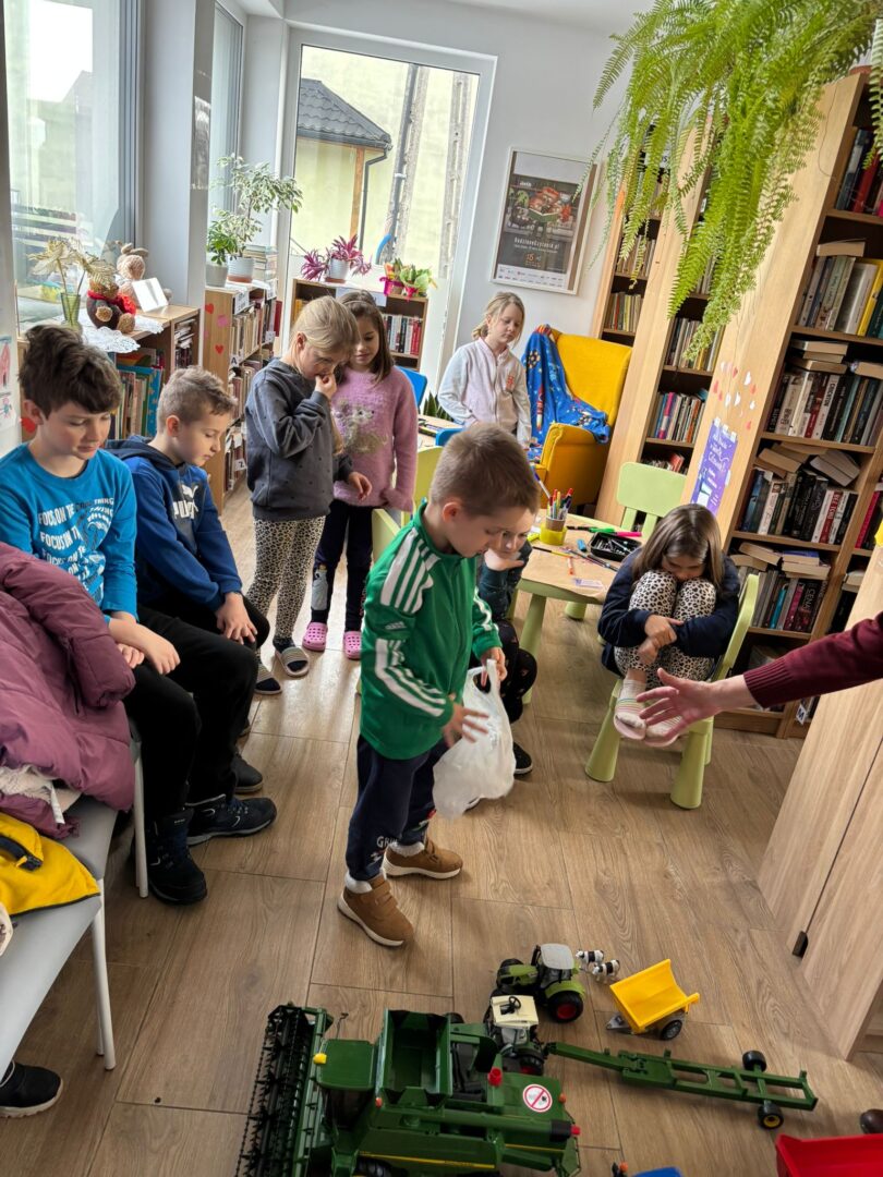 z zaciekawieniem słuchali i oglądali przyniesione maszyny – zabawki.