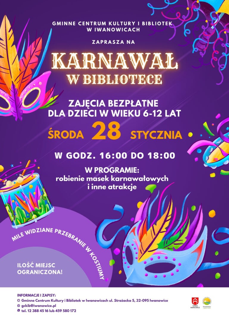 Już w środę 28 stycznia Gminne Centrum Kultury i Bibliotek w Iwanowicach organizuje wyjątkowe karnawałowe spotkanie dla dzieci w wieku 6–12 lat!