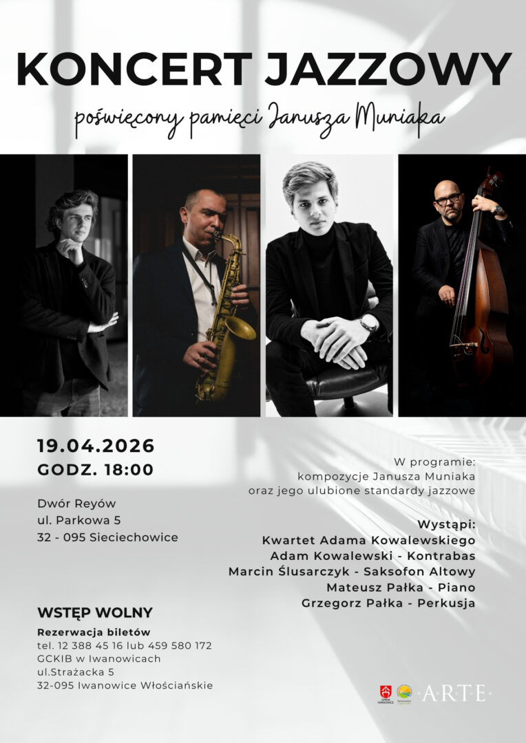 Gminne Centrum Kultury i Bibliotek w Iwanowicach serdecznie zaprasza na koncert jazzowy poświęcony pamięci wybitnego muzyka – 𝐉𝐚𝐧𝐮𝐬𝐳𝐚 𝐌𝐮𝐧𝐢𝐚𝐤𝐚.